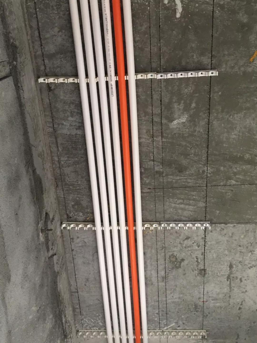 線管采用排卡固定,在施工前先進行彈水平垂直線,這樣能很好地確保每根線管的橫平豎直,后續水電圖的精準度,同時可以很好避免其他工種施工時對線路進行傷害。