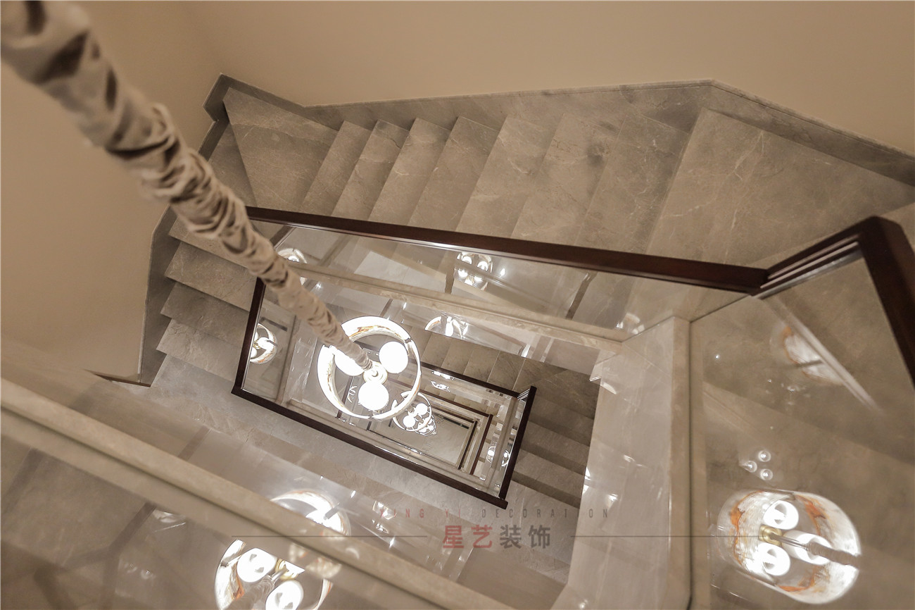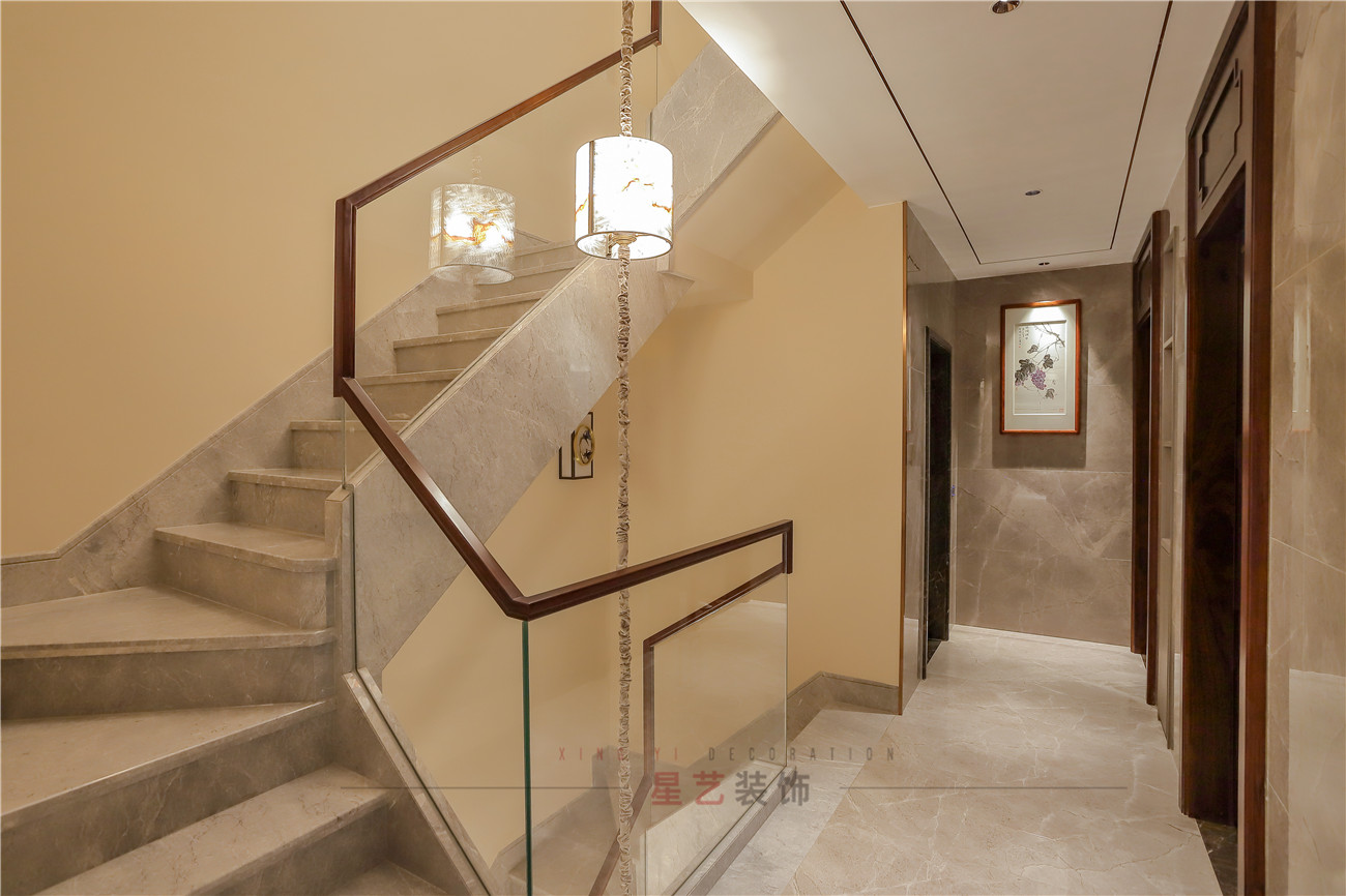 樓梯上巧妙的用了質地輕盈,通透的玻璃材質,富有時尚氣息,把燈卻做成傳統的燈籠形象,也是設計師對新中式的融會貫通,強化中式底蘊。