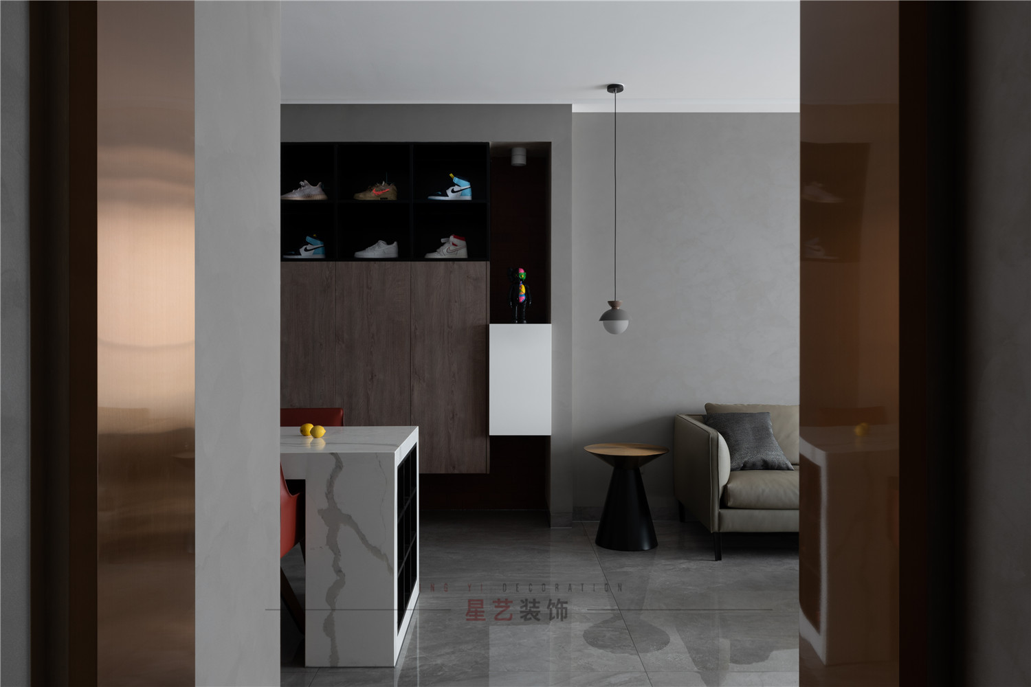 此項目業主是一個單身男士,喜歡收藏些手辦模型玩具和潮鞋,一直有個動漫宇宙幻想。設計師以宇宙金星為主題展開設計,從材質上運用了灰色凹凸感涂料象征金星的地表質感,用金色鏡鋼象征了金星特有的順色,黑白色的巖板代表了宇宙的光明和黑暗。