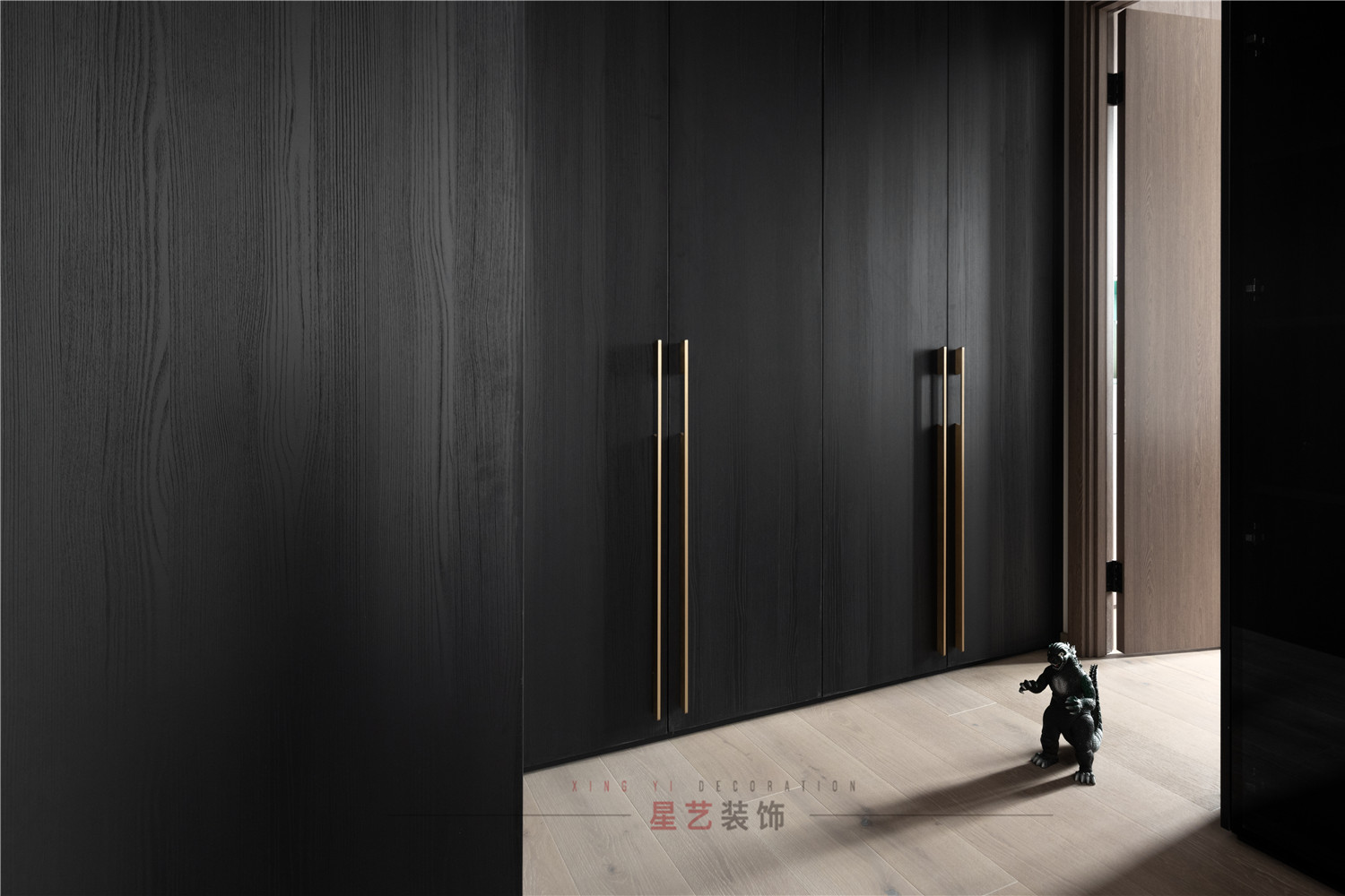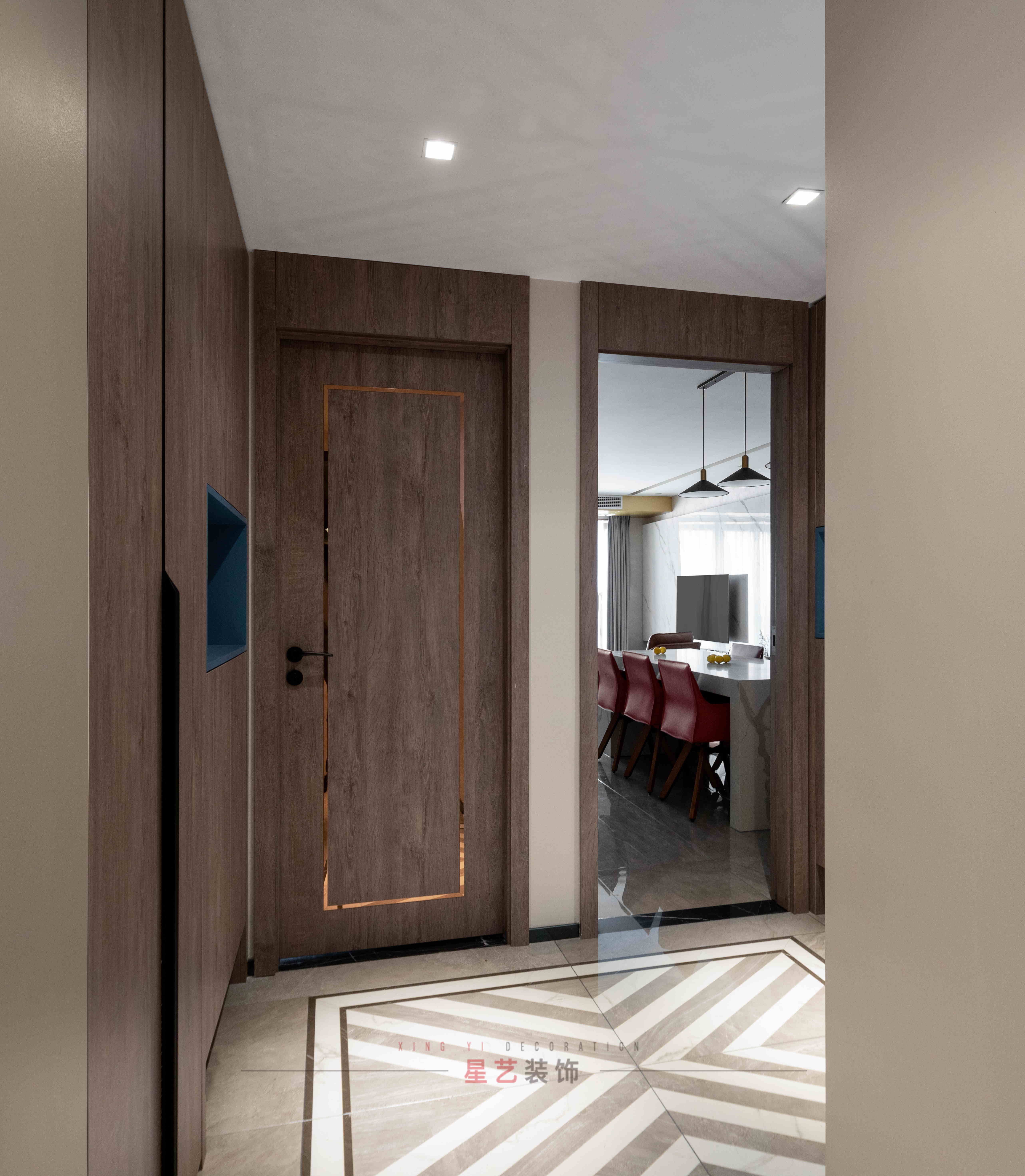 木色門嵌入金色邊框,簡潔大氣充滿時尚感。